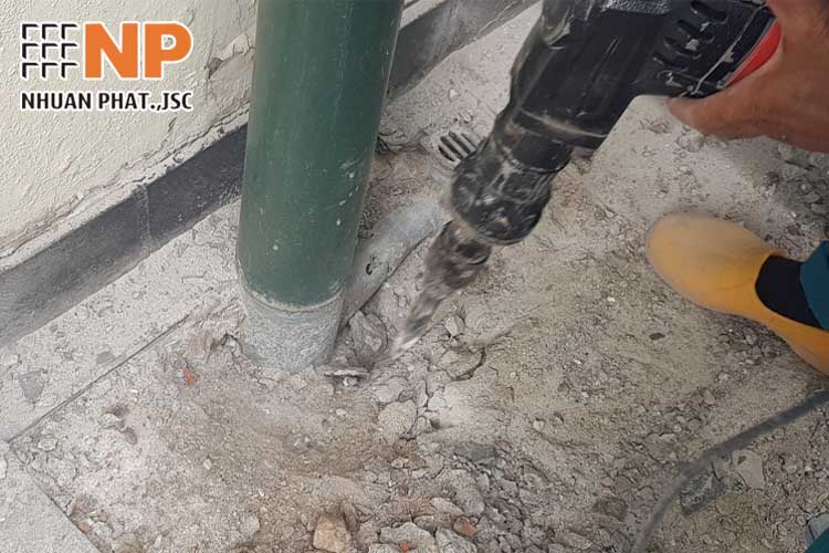 - Làm sạch bề mặt cần chống thấm, dọn dẹp nước đọng và các chướng ngại vật, bê tông và các lớp vữa dư thừa bằng búa băm.